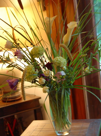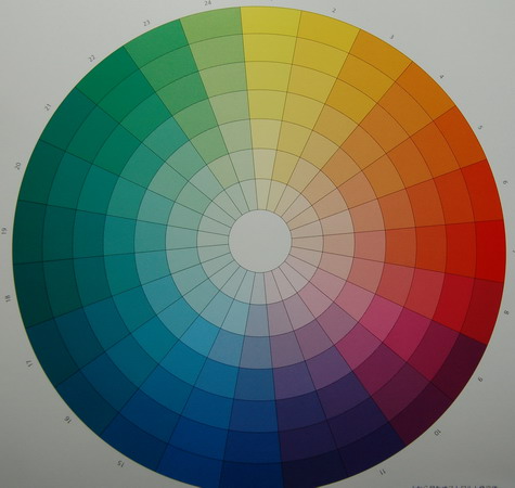 初秋は、すすきの穂が風にゆれ、あわや野バラの実、姫りんご、山ぶどう、ヒペリカムなど、まだ熟さない明るいグリーンの実、あるいは、深い赤紫色のわれもこう、からし色の姫がまなど実のものがふんだんな季節。青や紫色のききょう、りんどう、トルコぎきょう、デルフィニュームもこの時期。フラワーアレンジメントを習っていた時期、先生にチョイスしてもらった時には、素敵な作品に仕上がるけれど、花屋さんで自分が選ぶとなると、なかなか難しかった。こんな時カラーホイールを参考にすると色と色の関係がわかり、組み合わせがし易くなります。カラーホイールを使うと反対色が簡単にみつかります。黄色と紫、オレンジと青、赤と緑というように。写真の作品は、私の好きなパステルカラーの黄緑色のカーネーションをまず選び、これを引き立てる1色として、今回は反対色の青紫のデルフィニュームやトルコぎきょうをあわせることにしました。次に黄緑色をささえる色として、カラーホイールの近隣の色から実のものやすすきを選んでみました。カラーホイールは、花の組み合わせや洋服のコーディネートなどいろんな場面に活用できて便利です。